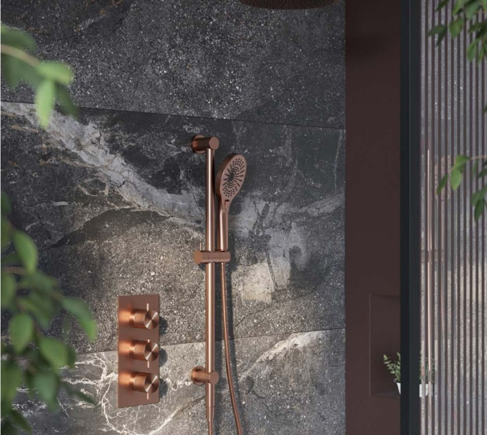 This knurled modern shower has been made from solid brass, with the shower head and handset made from ABS. The shower has a plated finish in modern satin bronze colour.