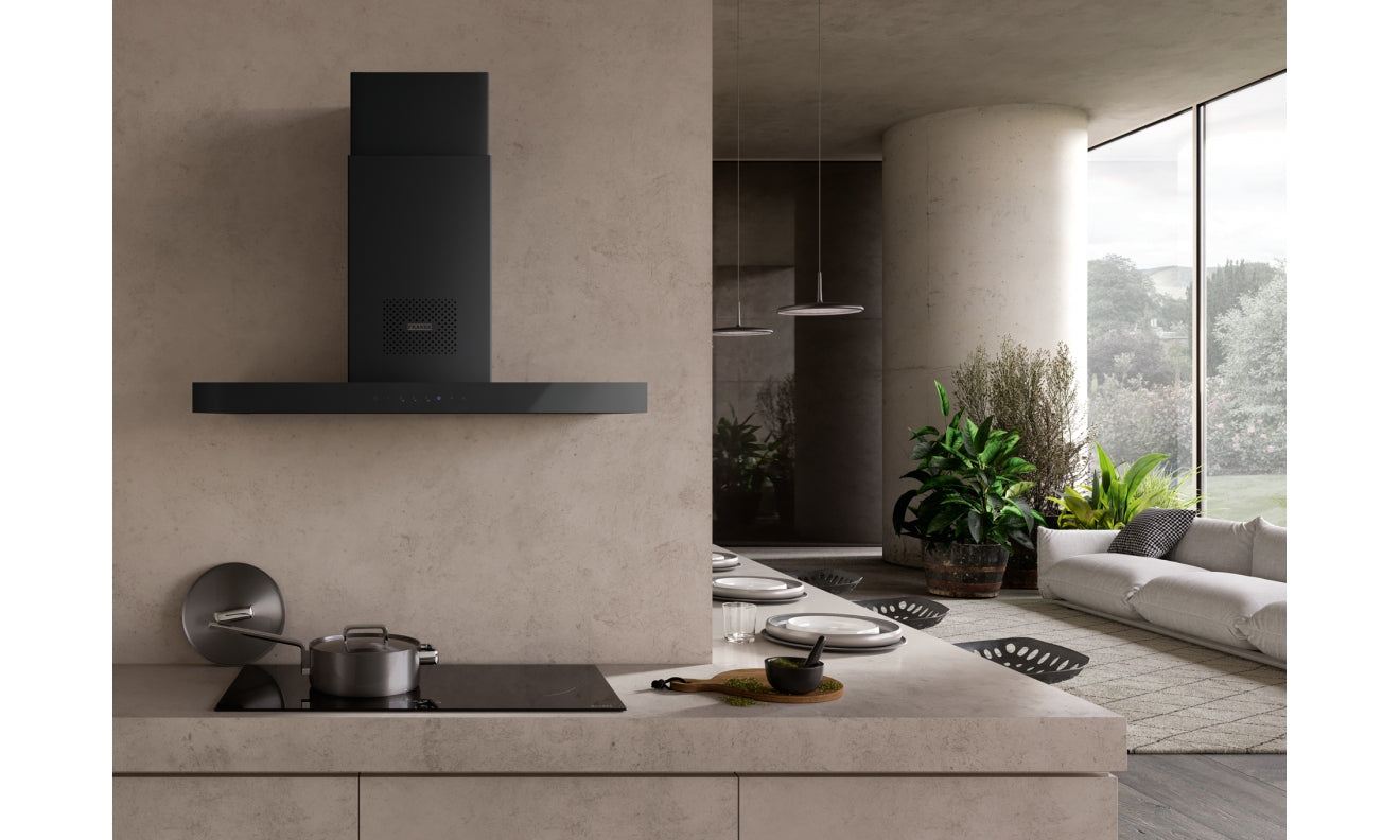 The Franke Mythos T‑Shape Air Hub FTMY AH BK F90 is a premium 90 cm wall‑mounted cooker hood that combines powerful extraction with advanced air‑sanitising technology. Its bold T‑shape design and sleek black finish make it a strong architectural feature in modern kitchens, while the integrated Air Hub system helps purify the air beyond standard ventilation.