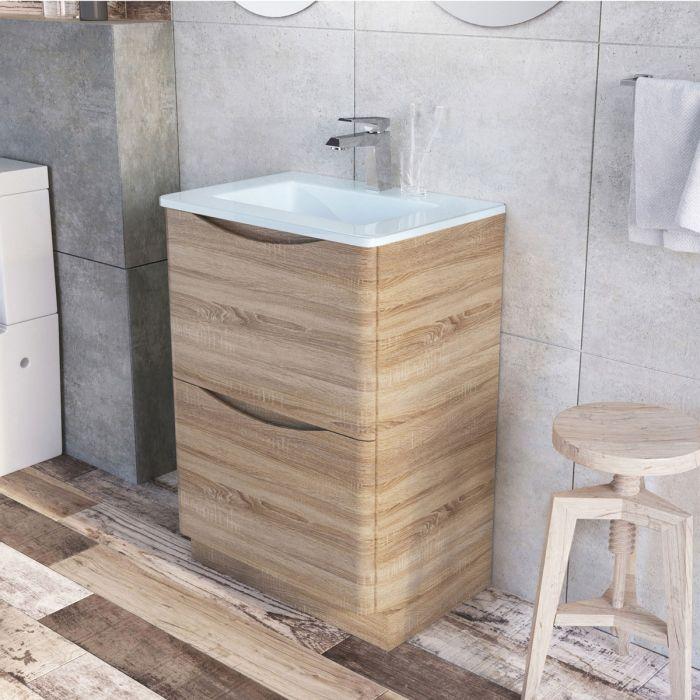 Montana 600mm Floorstanding Vanity Unit in Light Oak & White Glass Basin