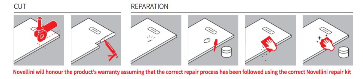 The Novellini Novosolid repair kits must be used when you trim or adjust the tray for your situation. You will need to use the repair kit to seal the open cuts before final installation.