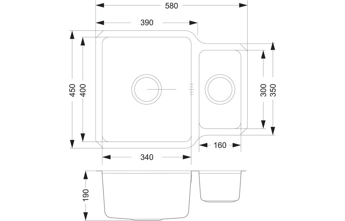 Specifications: – Overall Dimensions: W 580 × D 450 × H 190mm – Main Bowl: W 340 × D 400 × H 190mm – Half Bowl: W 160 × D 300 × H 110mm – Cut-Out Size: W 540 × D 300mm – Minimum Cabinet Width: 600mm – SKU: CPR052