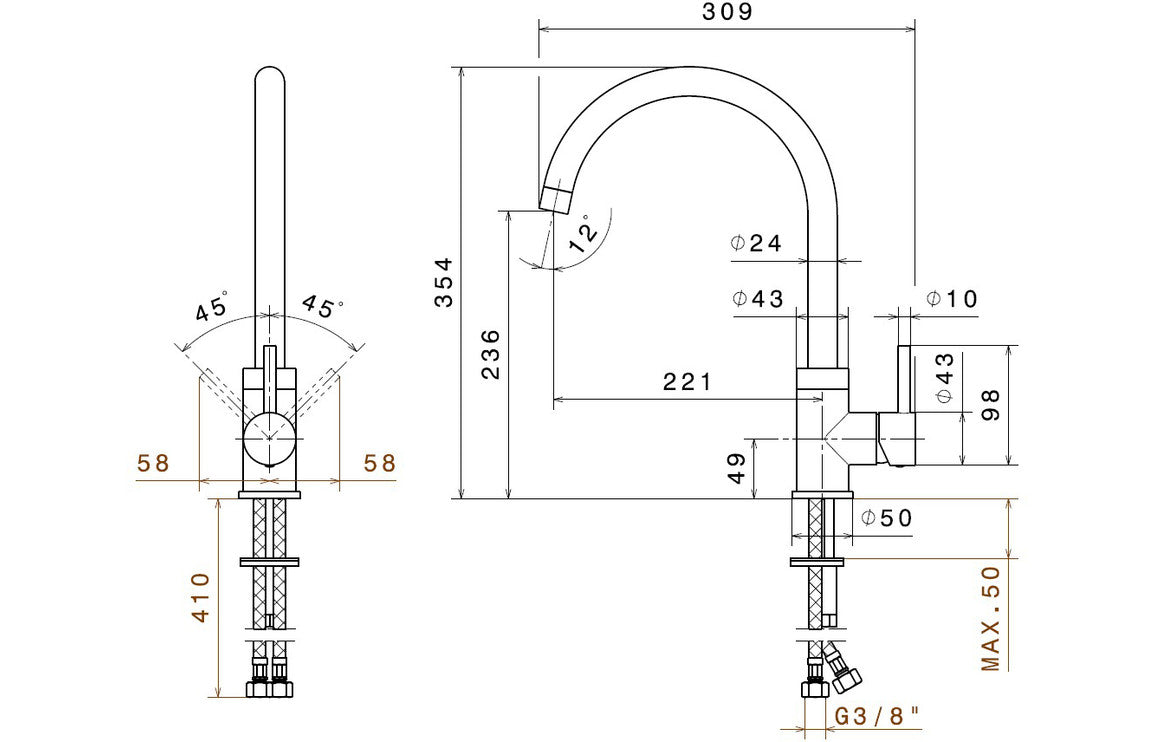 - Tap Dimensions: Overall Height - 354mm; Spout Height - 236mm; Spout Reach - 221mm; Base/Handle Width - 43mm
